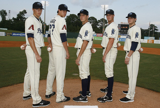 Patrick Corbin, Tyler Skaggs, Trevor Bauer, Charles Brewer and Jarrod Parker (l-r). Courtesy of Chip English/Mobile BayBears