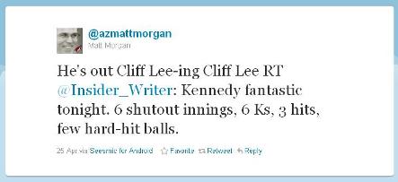 On the night of April 25, while Ian Kennedy was shutting out the Philadelphia Phillies, en route to striking out 10 batters in a duel with Cliff Lee the day after his daughter, Nora, was born, I received this message on Twitter: