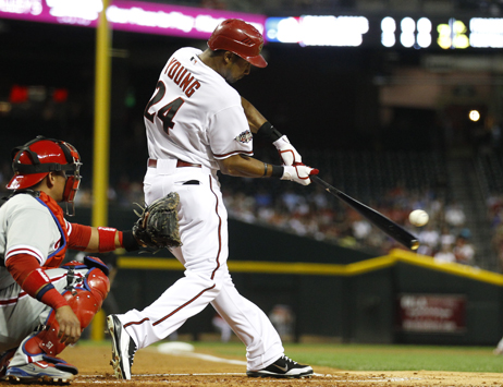 In the fifth inning, he came to the plate with Kelly Johnson on second base and two outs, with the D-backs trailing by a run. It was an important RBI opportunity for Roberts, to get the game tied up in support of Armando Galarraga. In Roberts’ second at bat, back in the third inning, Reds pitcher Sam LeCure got him to swing on a fastball that was out of the strike zone. But LeCure didn’t execute the pitch as well this time.